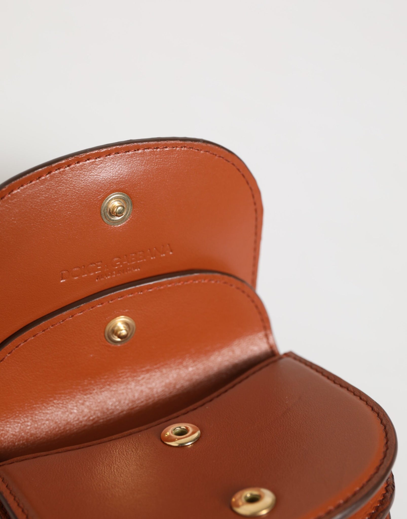 Crafted from premium calf leather, this compact purse features a bold brown leopard print with a structured silhouette. The interior is smooth brown leather with dual compartments and a secure snap button closure. Finished with a gold-tone Dolce & Gabbana logo plaque at the front, this accessory is both practical and chic.