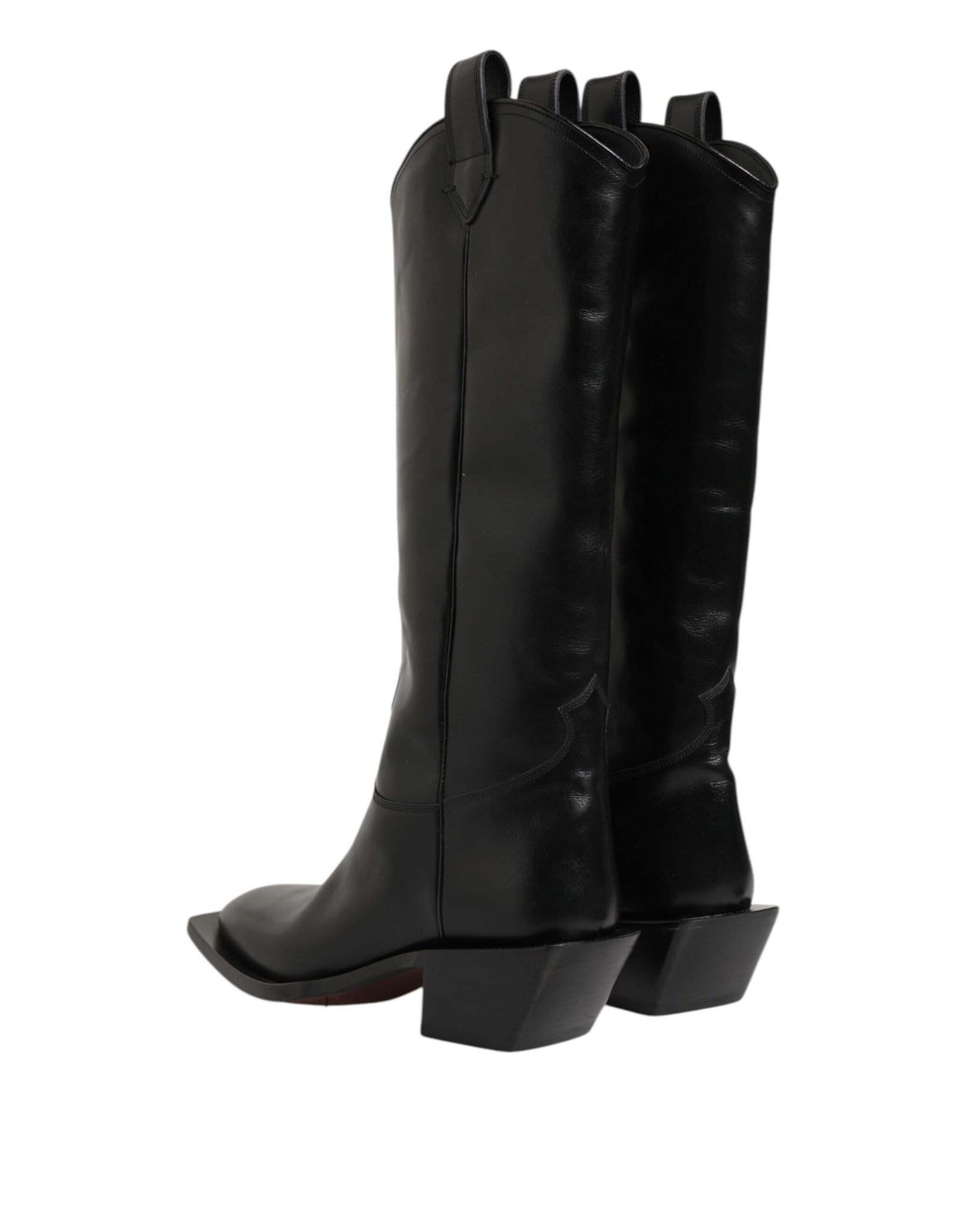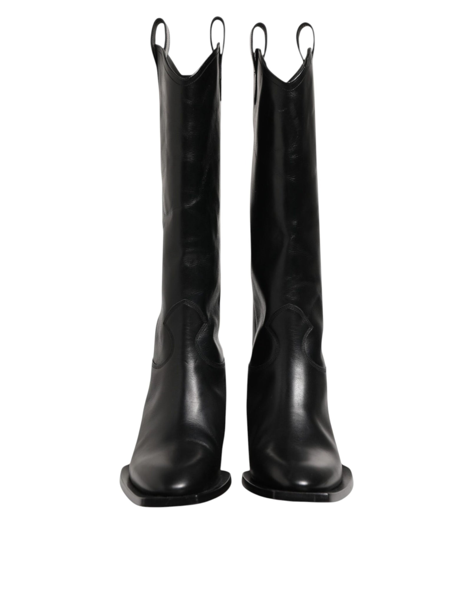 boots feature a sleek black finish. Designed with an over-the-calf silhouette, they offer a striking style statement while providing a comfortable fit. Perfect for pairing with skirts, dresses, or slim trousers for an effortlessly chic ensemble.