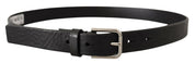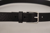 Bälte i svart kalvskinn med silverfärgad metallspänne med logotyp.