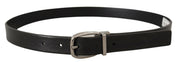 Svart läderbälte med silverfärgad krommetallspänne med logotyp.