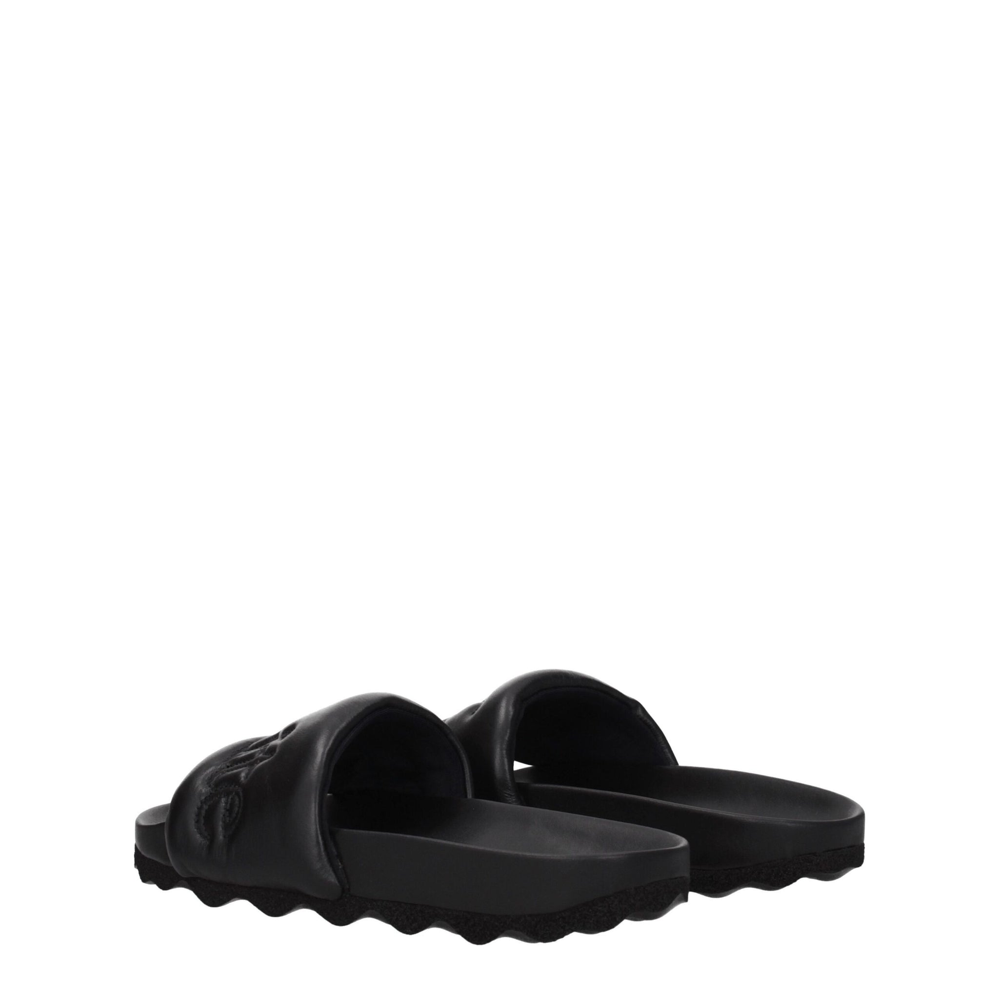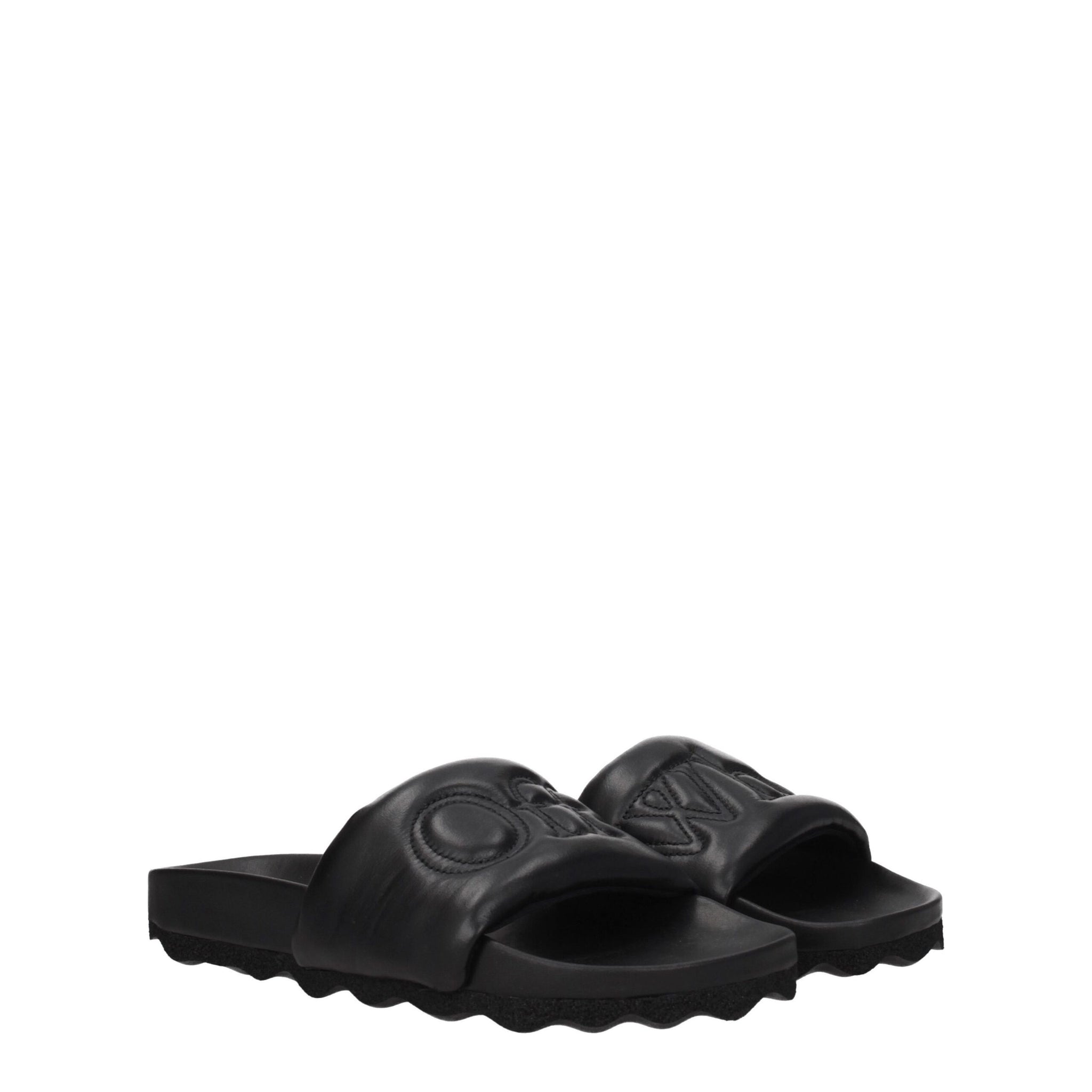 The product with MPN OMIT001LEA0011010 and code F77104 leather in black is a slippers and clogs designed by Off-White. It has features like front logo.