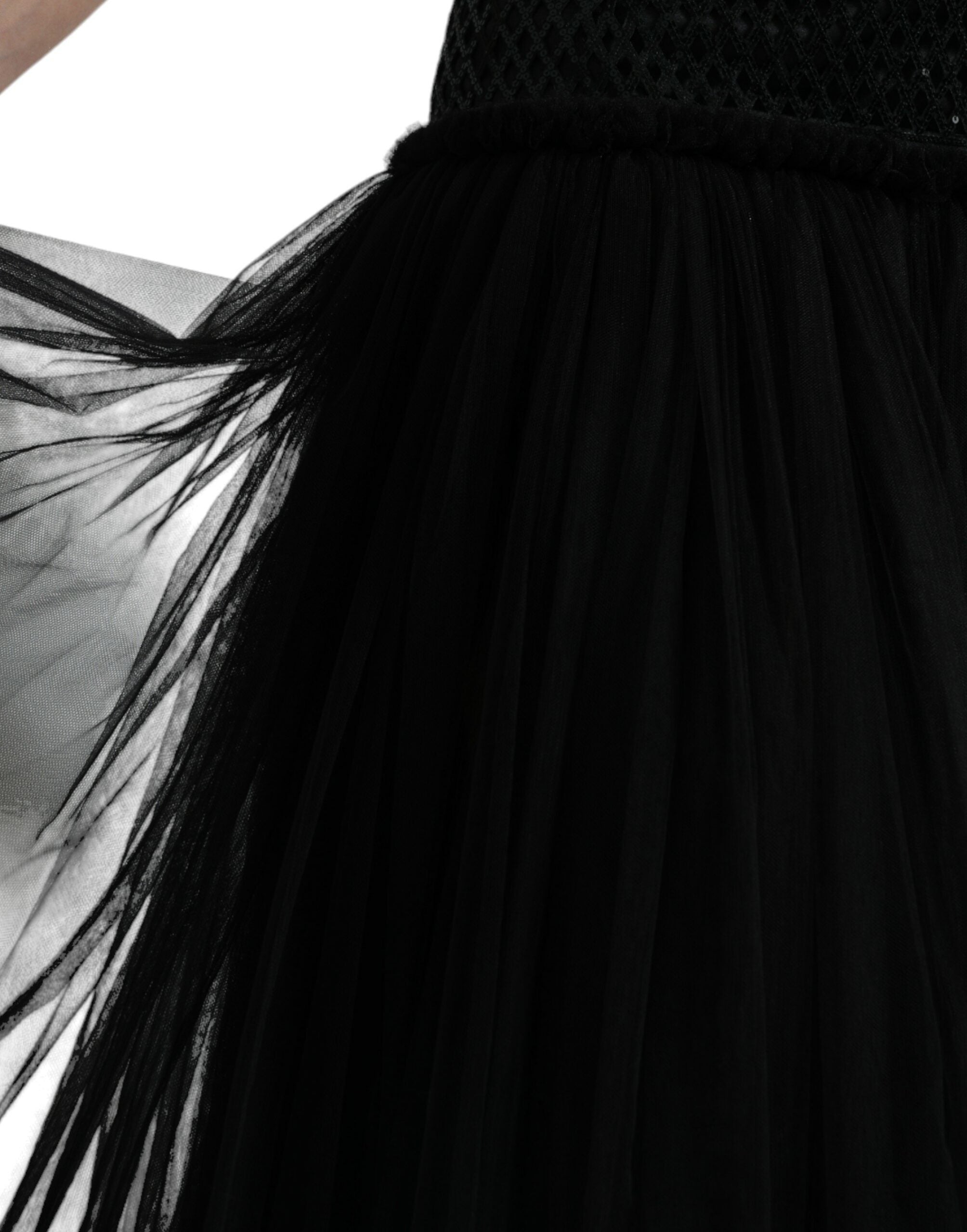 Gorgeous brand new with tags, 100% Authentic Dolce & Gabbana black evening dress with a low waistline. The bodice of the sleeveless model is made of openwork mesh, completely covered with glossy sequins. Features a multi-layered hem, they used translucent tulle, draped with small folds.