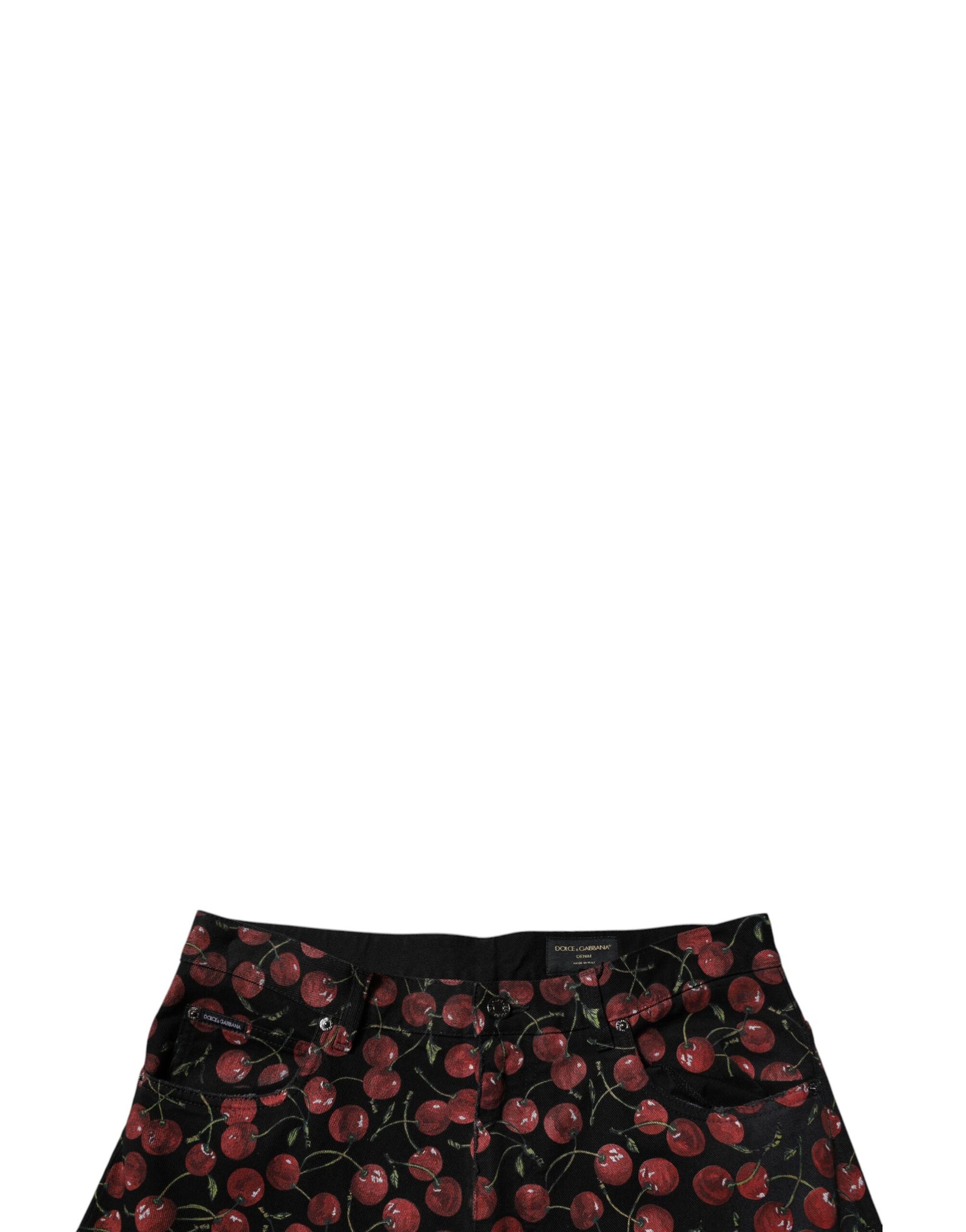 Gorgeous brand new, 100% Authentic Dolce & Gabbana cotton denim jeans with cherry print features a zipper and button closure.