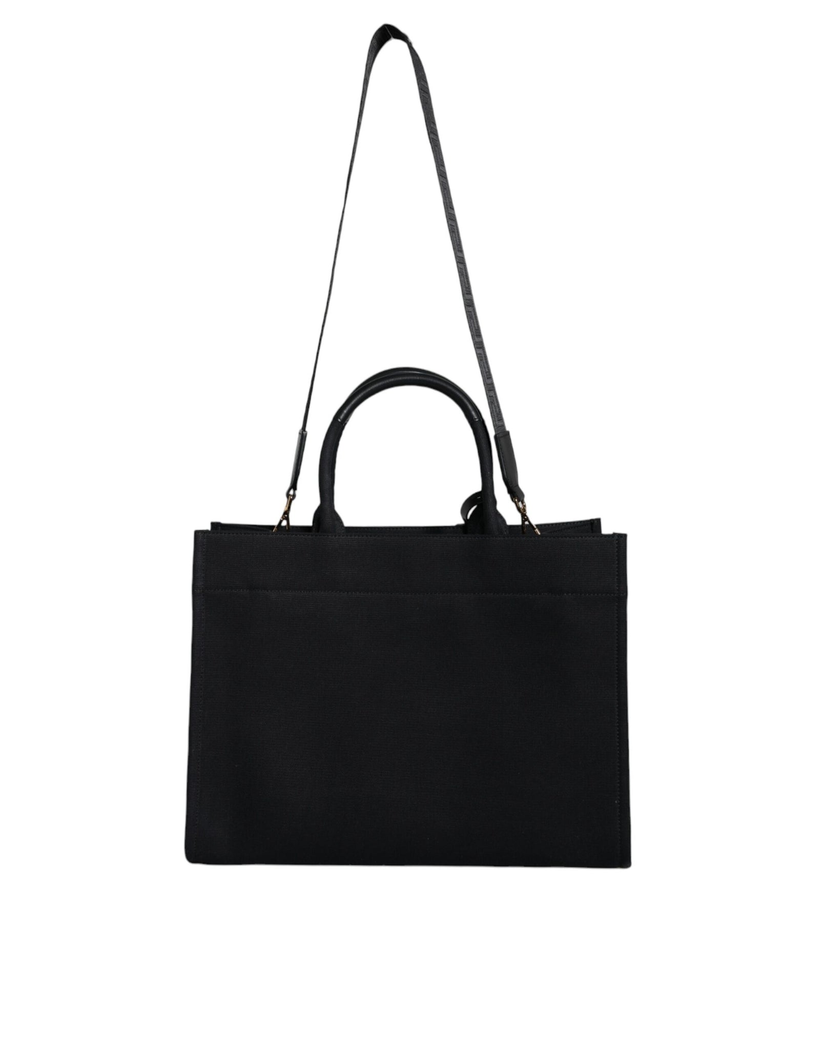 Svart handväska i läder och canvas med logotyp, bärs i handen eller över axeln.